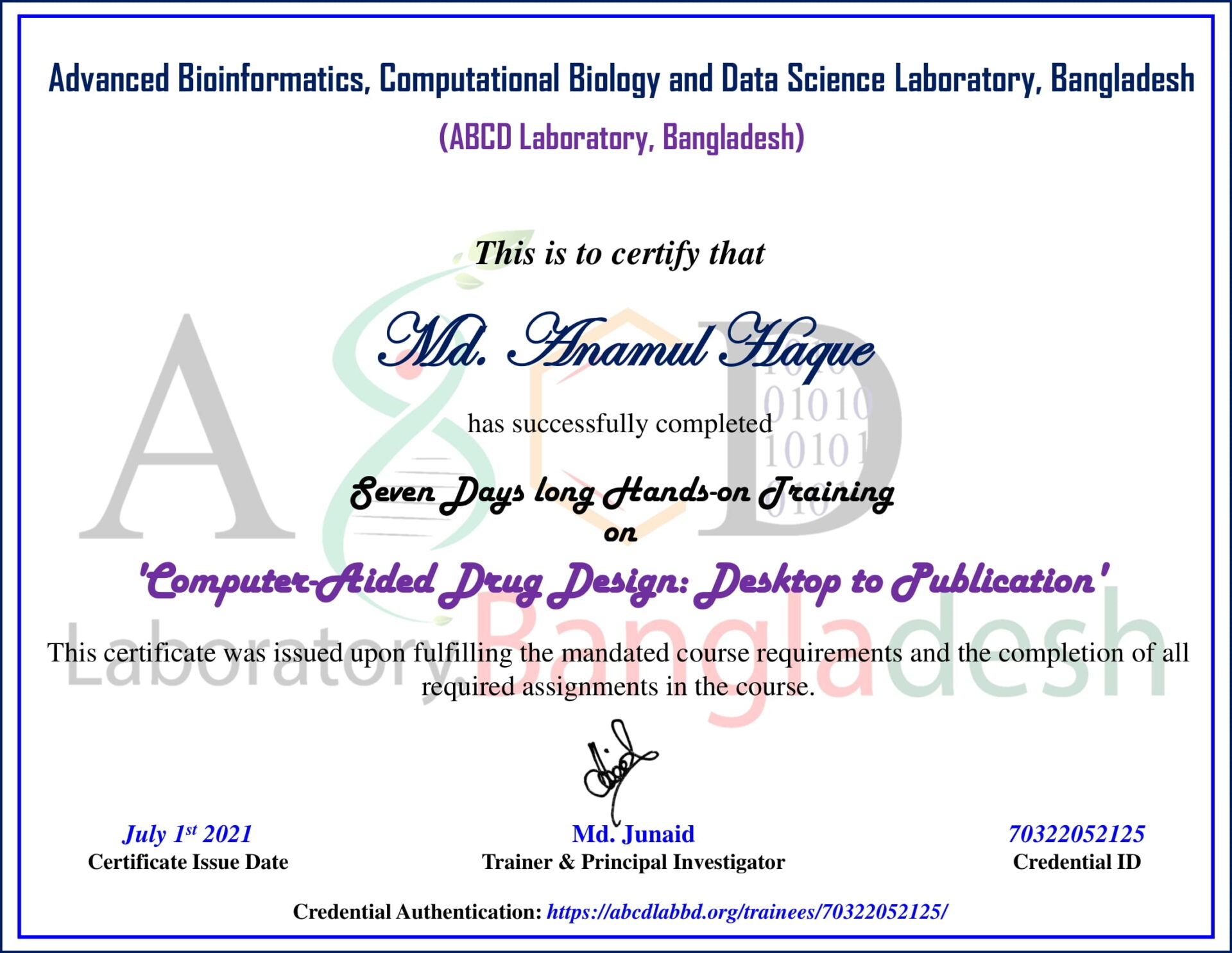 Md. Anamul Haque is a trainee of 7 Days long Hands-on Training on ‘Computer-Aided Drug Design: Desktop to Publication’ which was held from 22nd May to 12th June 2021 at Advanced Bioinformatics, Computational Biology and Data Science Laboratory, Bangladesh (ABCD Laboratory, Bangladesh). He successfully fulfilling the mandated course requirements and the completion of all required assignments in the course with bearing the below credential id.