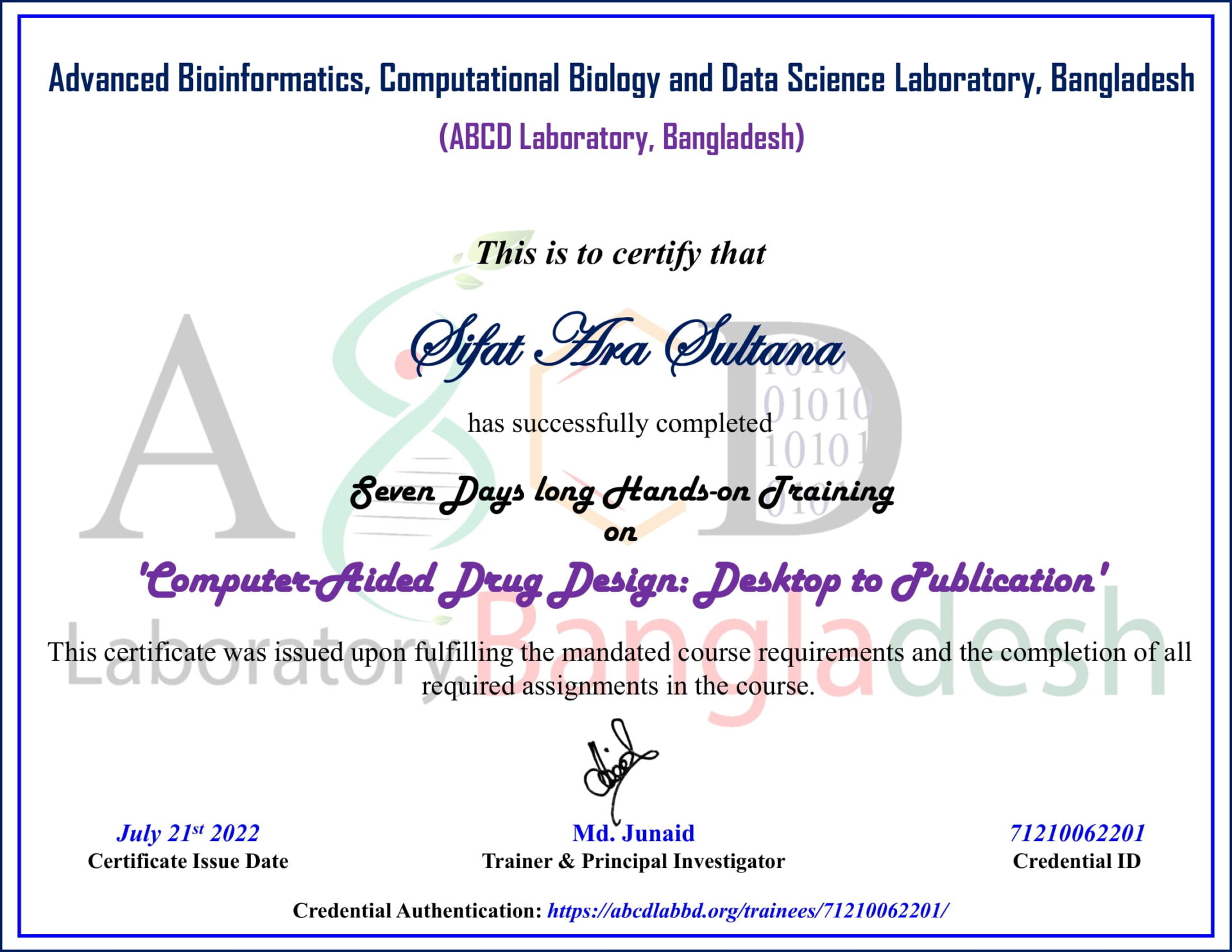 Sifat Ara Sultana is a trainee of 7 Days long Hands-on Training on ‘Computer-Aided Drug Design: Desktop to Publication’ which was held from 10th June 2022 to 01st July 2022 at Advanced Bioinformatics, Computational Biology and Data Science Laboratory, Bangladesh (ABCD Laboratory, Bangladesh). She successfully fulfilling the mandated course requirements and the completion of all required assignments in the course with bearing the below credential id.