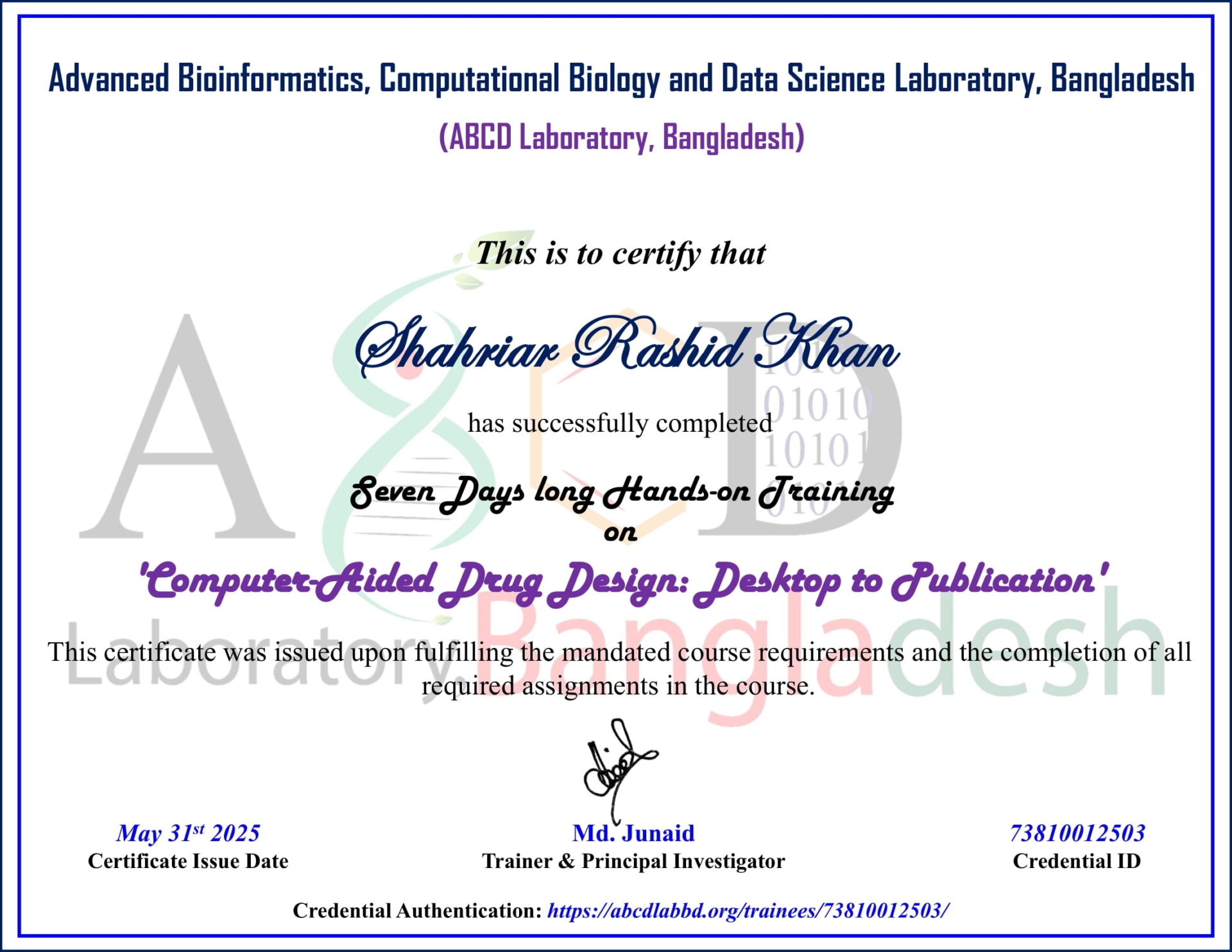 Shahriar Rashid Khan is a trainee of 7 Days long Hands-on Training on ‘Computer-Aided Drug Design: Desktop to Publication’ which was held from 10th January to 31st January 2025 at Advanced Bioinformatics, Computational Biology and Data Science Laboratory, Bangladesh (ABCD Laboratory, Bangladesh). He successfully fulfilling the mandated course requirements and the completion of all required assignments in the course with bearing the below credential id.